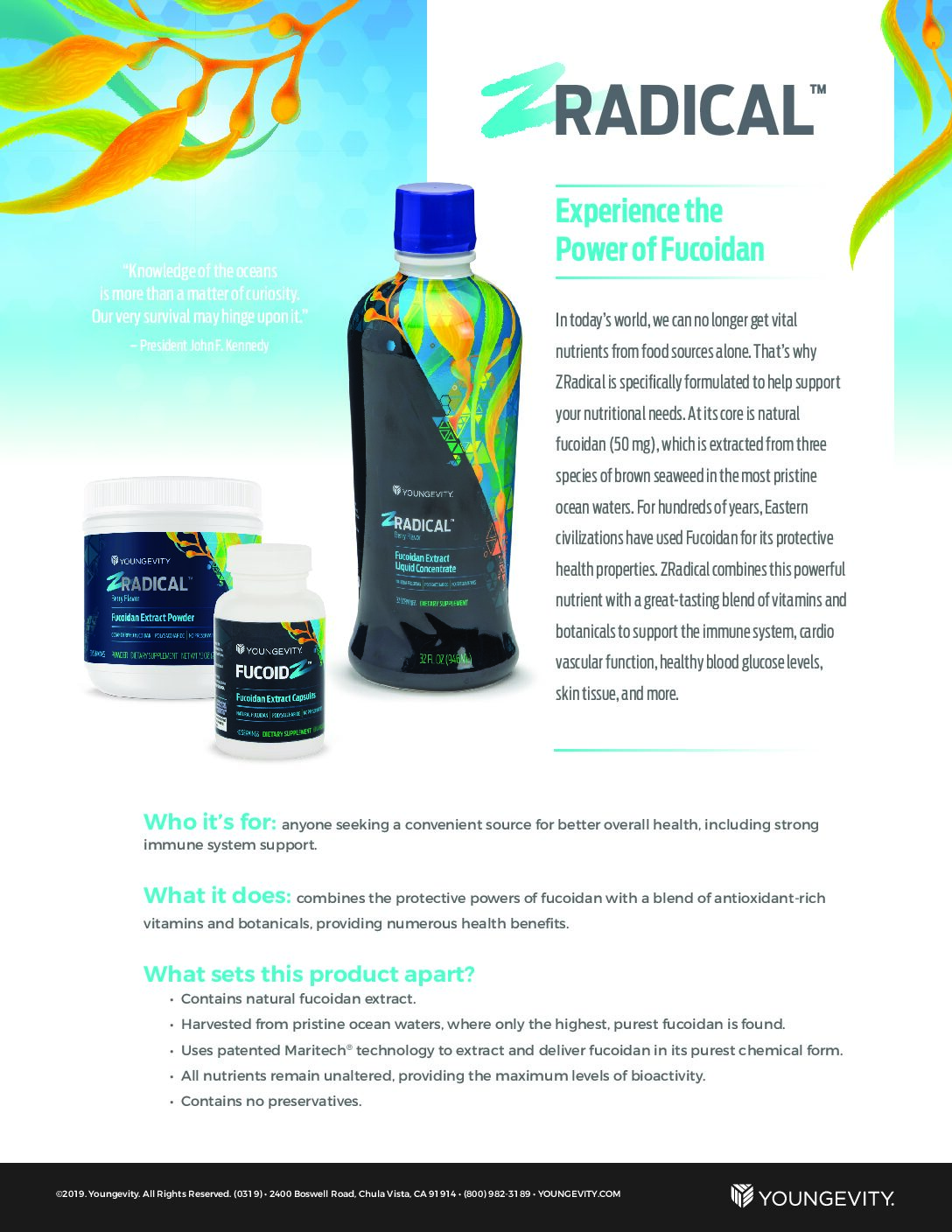 In today’s world, we can no longer rely only on a healthy, balanced diet to provide all the nutrients we need. Thanks to ZRadical TM Liquid proprietary blend of pure fucoidan, vitamins, and beneficial botanicals, you can get everything you need in one tasty, convenient daily supplement. At its core is natural fucoidan, which is extracted from brown seaweed found in the most pristine ocean waters. This high-antioxidant blend is designed to support the immune system, cardiovascular function, healthy blood glucose levels, skin tissue, and more.